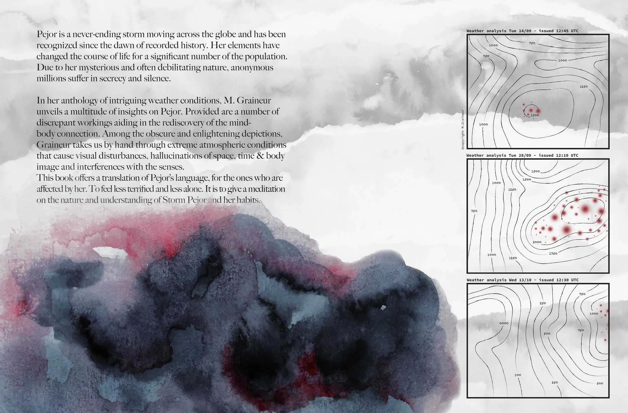 Storm Pejor is a metaphor and visualisation of my personal relationship with migraine. This book is a fictional story aiming to give a meditation on the nature and understanding storm Pejor and her Habits.